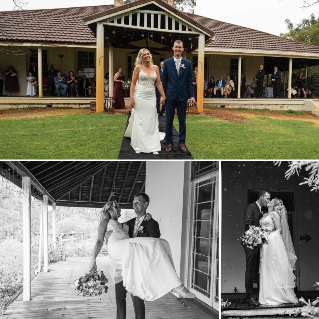 Luckily, the family property held another special option: the wide verandah of the 1800’s era homestead. With its weathered timber, the verandah provided not only shelter from the rain but also a sense of history and character. The ruins of the old mill nearby added a rustic charm, as though the past was quietly watching over this new chapter for Liz and Tristan.